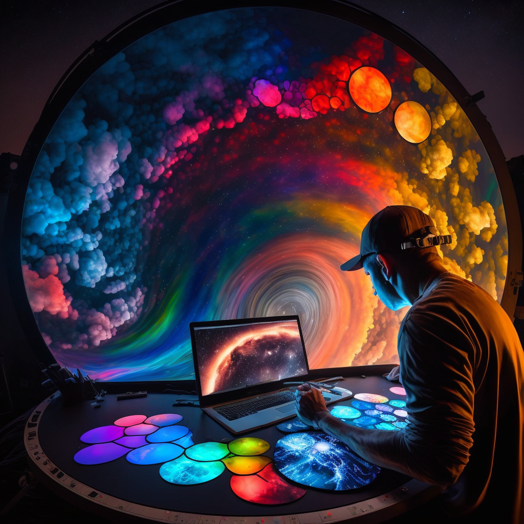 /imagine: "digital video artist, using a colorist control surface and looking at a computer screen, manipulating a living, organic, color wheel nebula"