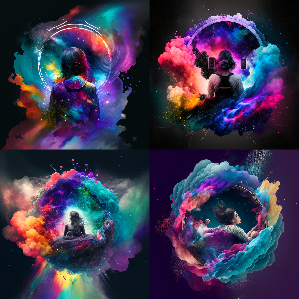 "digital video colorist, with a colorist control surface strapped to her back, trapped in a terrifying color wheel floating in a nebula"